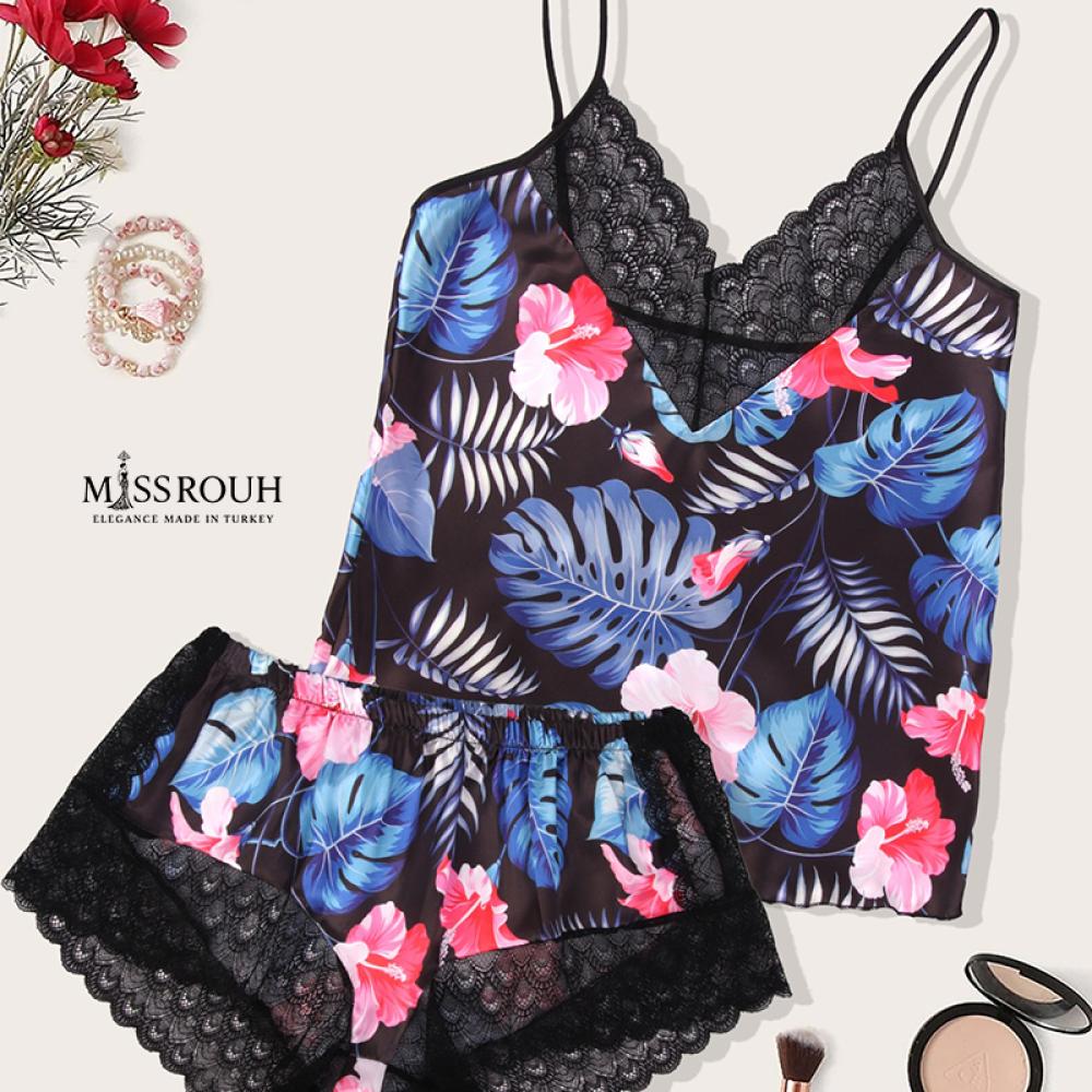 تمتعي بإطلالة أنثوية جذابة مع هذا الطقم المميز المصنوع من الساتان الفاخر، بتصميم أنيق مزين بنقشات استوائية زاهية تمنحك إحساسًا بالحيوية والجمال.