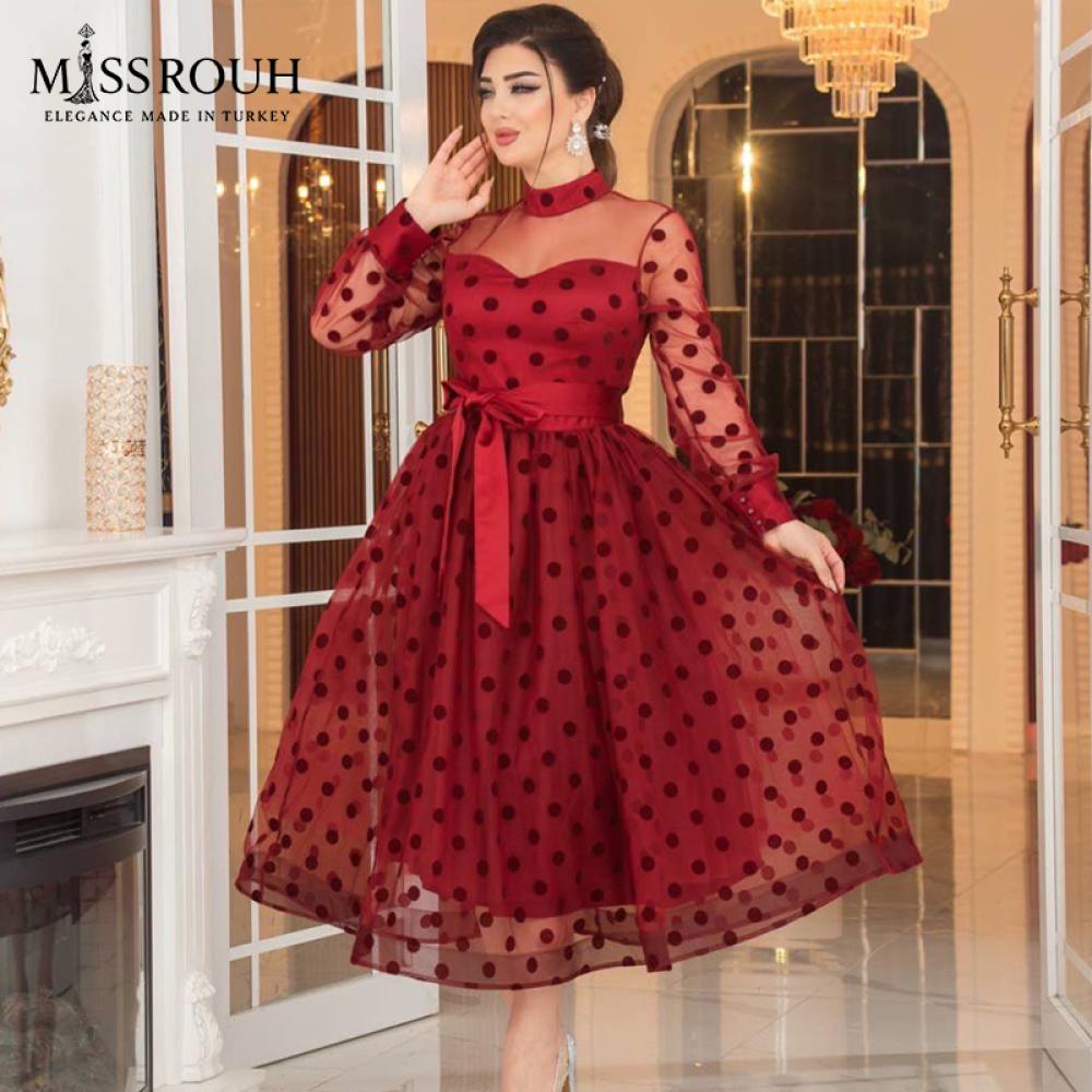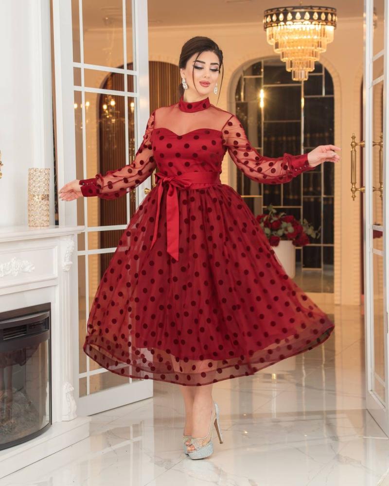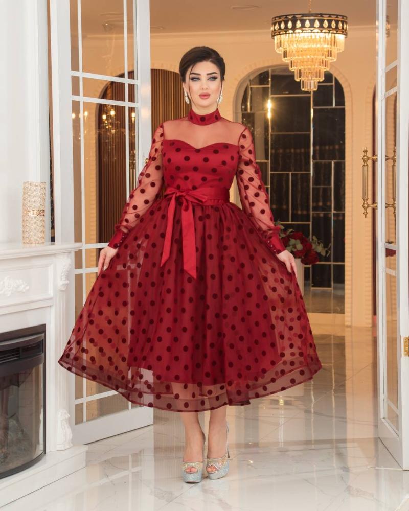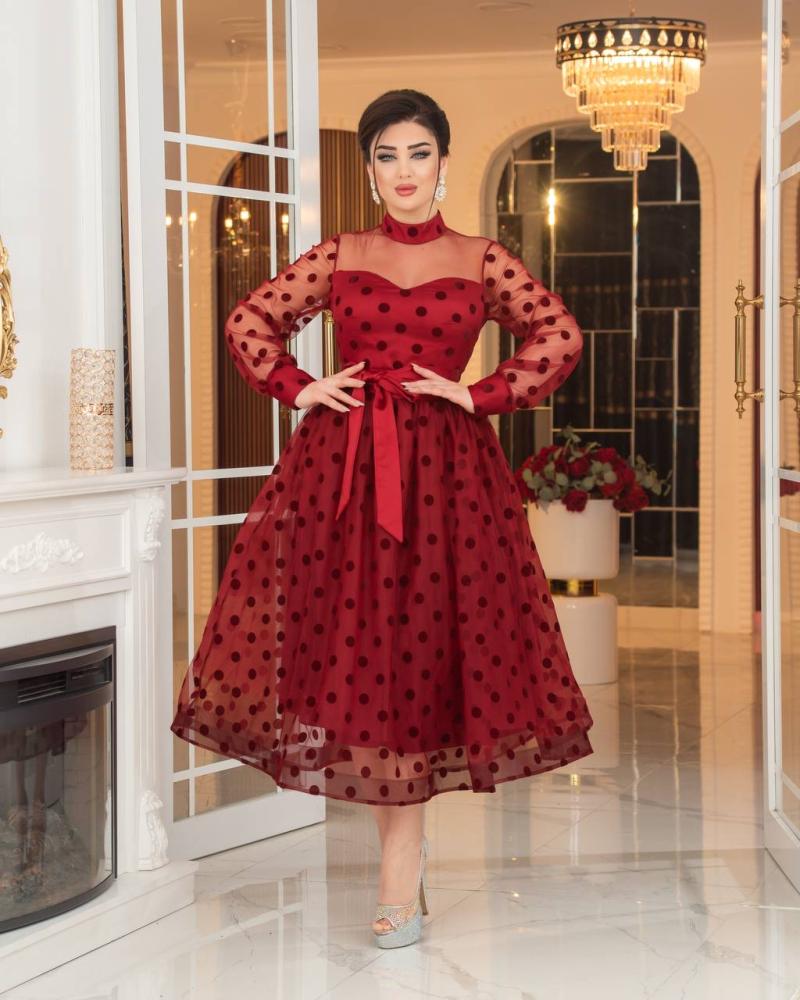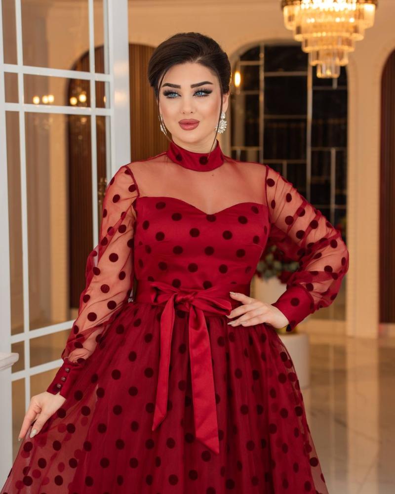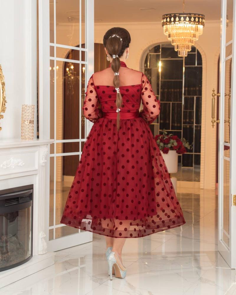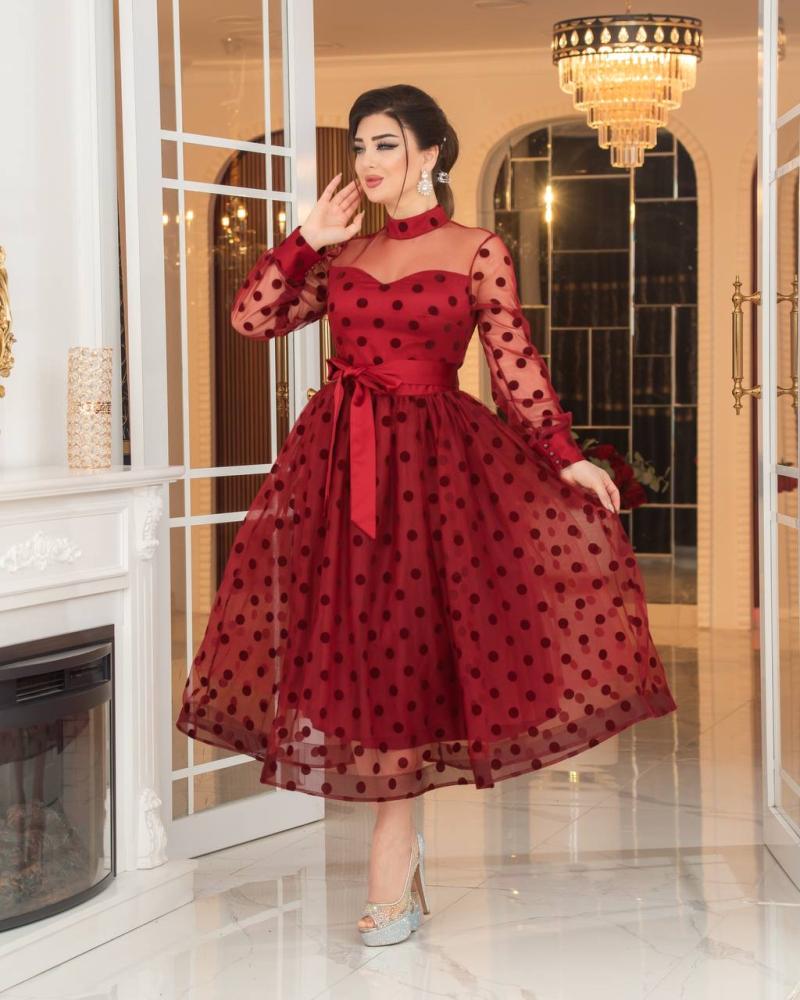 إطلالة أنيقة مستوحاة من الأسلوب الراقي تجمع بين التفاصيل الكلاسيكية واللمسات العصرية. يتميز التصميم بقماش منقط شفاف يضفي لمسة ناعمة وأنثوية، مع ياقة مرتفعة وأكمام طويلة تعزز جاذبية المظهر. يحدد الخصر بحزام رقيق ليبرز القوام بأسلوب جذاب، بينما تأتي التنورة الواسعة بقصة مميزة تمنحك حضورًا أنيقًا ومترفًا في المناسبات الخاصة والسهرات الفاخرة.