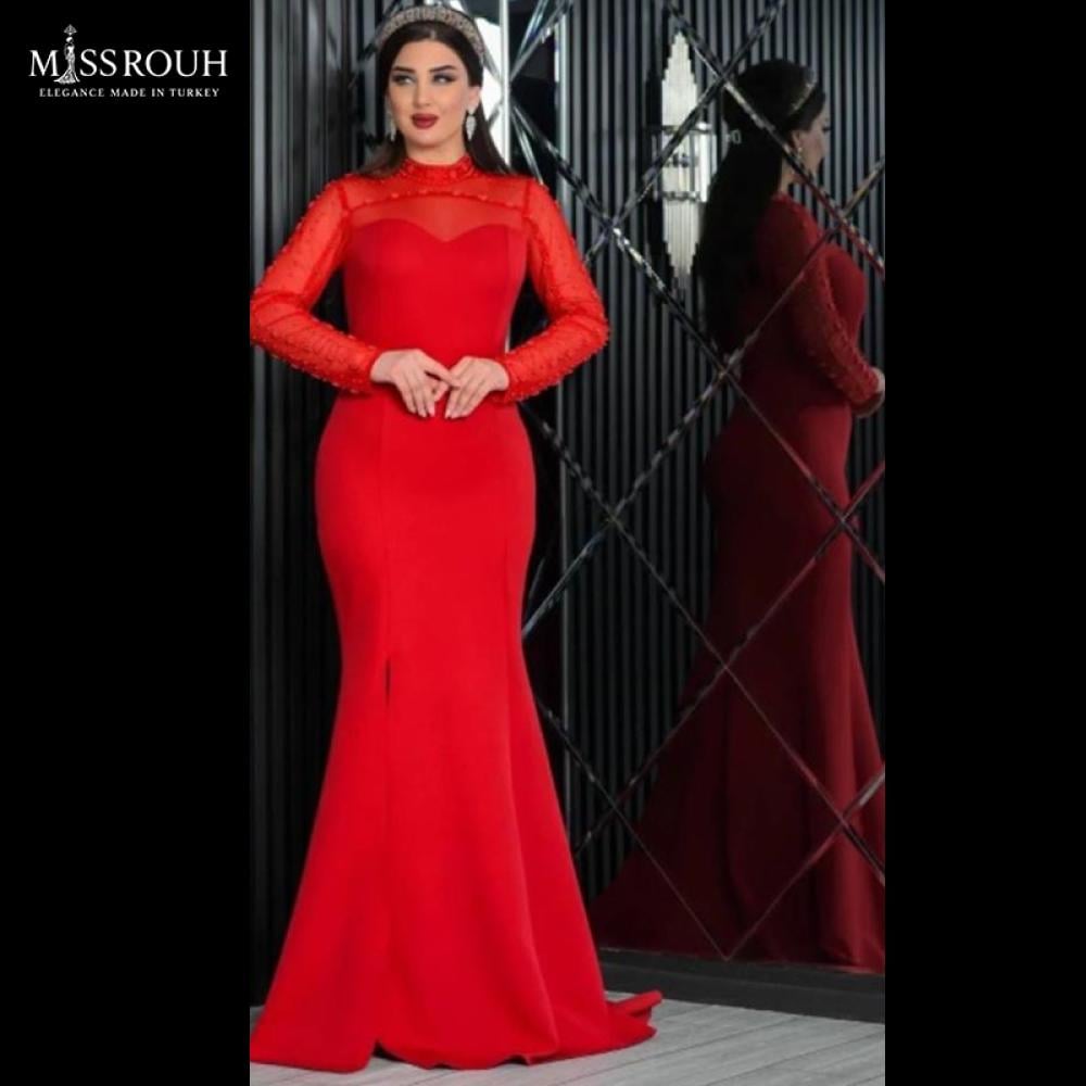 يتميّز بجزء علوي شفاف من التول المطرز يدويًا بحبّات لؤلؤ صغيرة، وأكمام طويلة أنيقة. قصة الخصر الضيقة والفتحة الأمامية الخفيفة تعزز رشاقة القوام وتعطيكِ حضورًا ملكيًا بكل المقاييس.