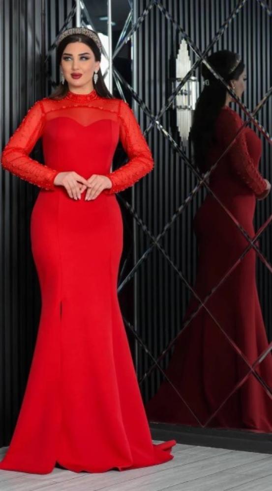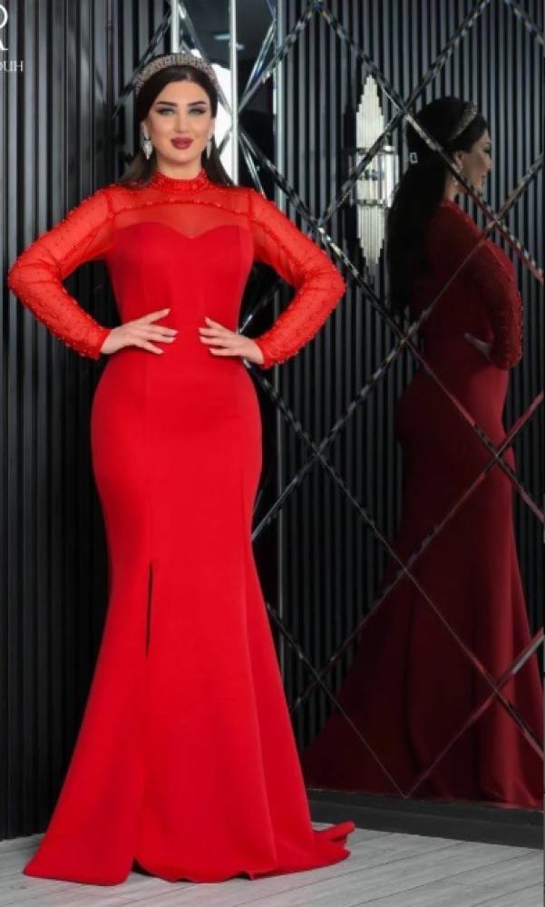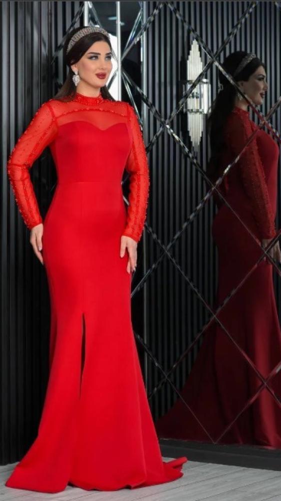 فستان "جُمان" بتصميم أنيق وملفت بلونه الأحمر الناري، مصمم بقصة حورية تضفي أنوثة طاغية.