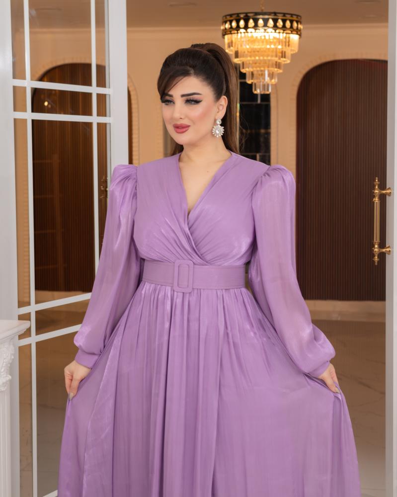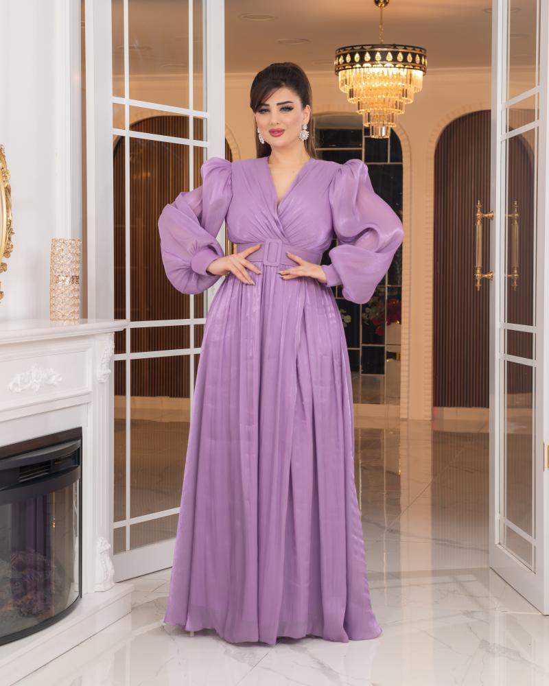 فستان يجسد الأناقة والأنوثة في كل تفاصيله، حيث يتميز بتصميمه الرائع الذي يجمع بين الفخامة والراحة. القماش الحريري الناعم يتناغم مع الأكمام المنفوخة، في حين يضيف الحزام الأنيق حول الخصر لمسة من الجاذبية. الفستان بتفاصيله الراقية والفتحة الجانبية يضفي لمسة من التألق والجرأة. يجسد هذا الفستان أسلوبًا عصريًا مليئًا بالحركة والنعومة، مما يجعله الخيار المثالي للمناسبات الرسمية والسهرات الراقية.