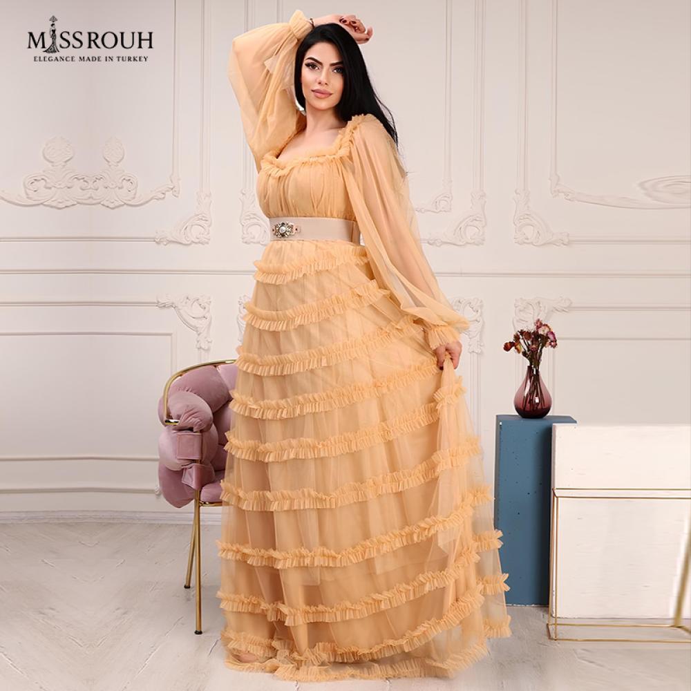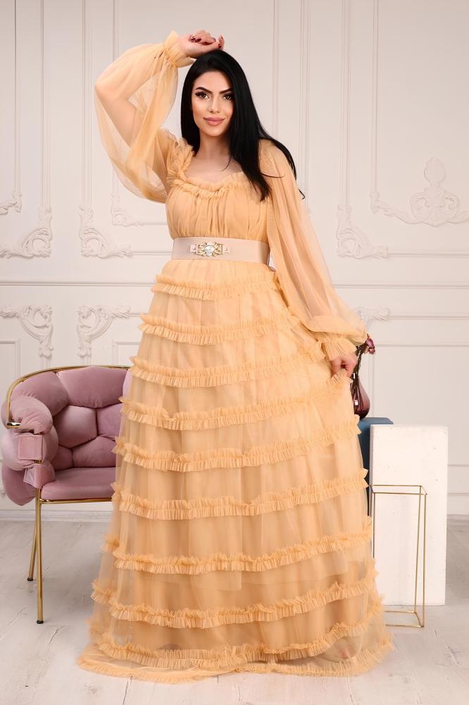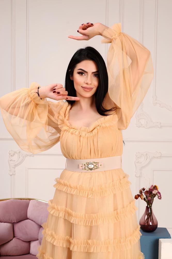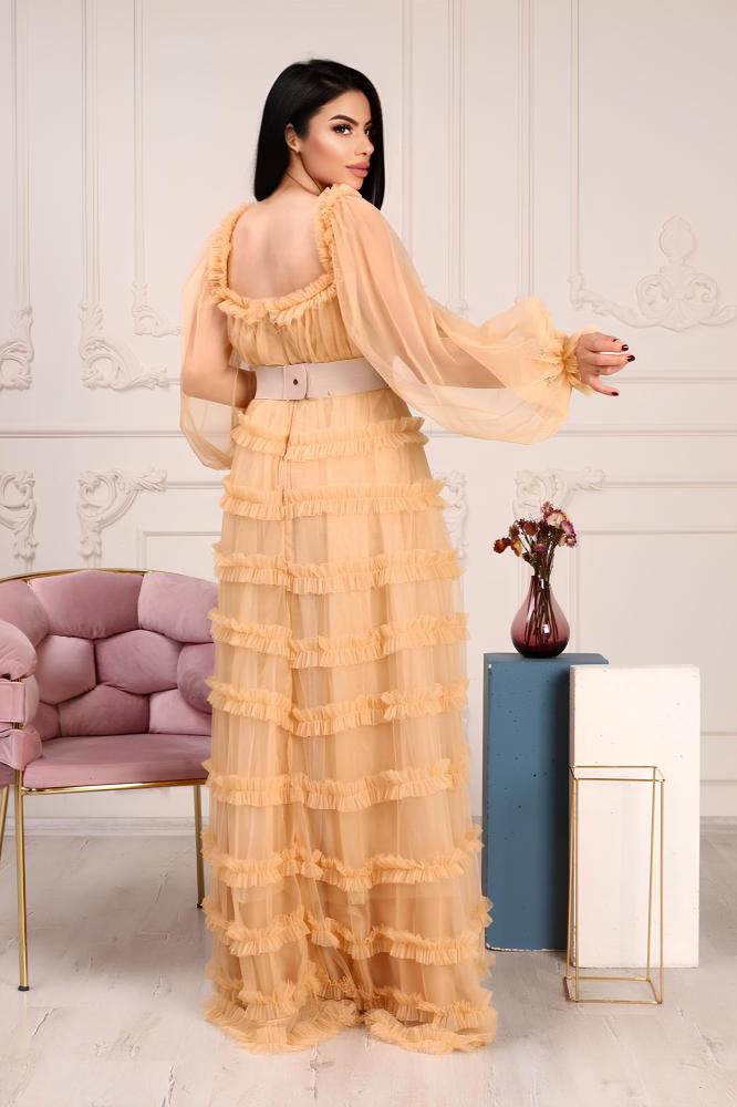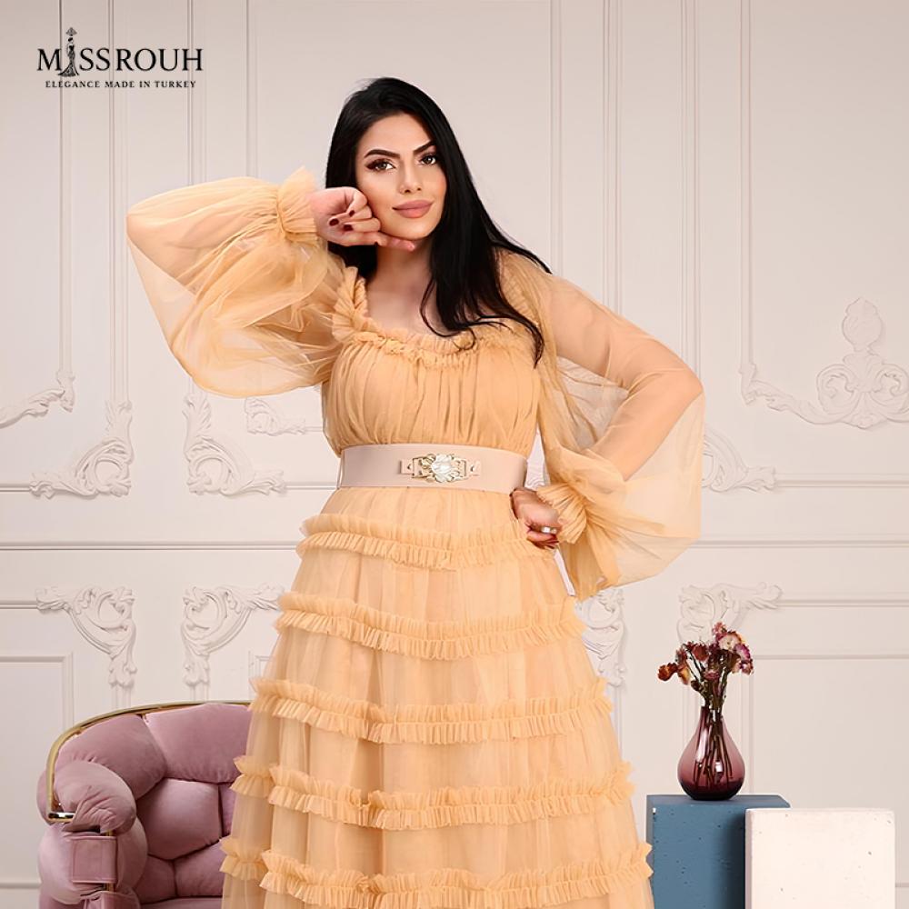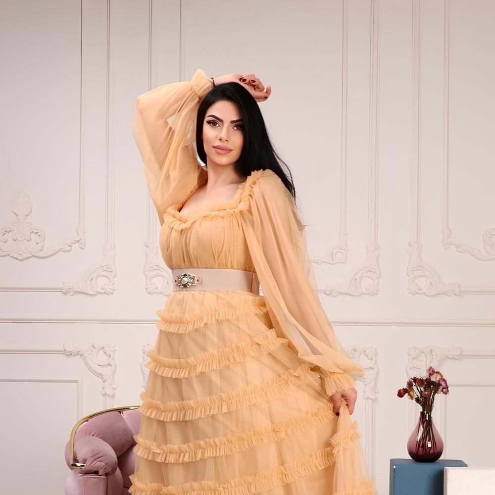 فستان ساحر بتصميم ملوكي يفيض بالأنوثة والجاذبية، يتميز بأكمام منسدلة كأمواج ناعمة تمنح حرية وانسيابية في الحركة، مع تنورة بطبقات غنية بتفاصيل رقيقة تضيف لمسة درامية أنيقة. حزام الخصر المزخرف يبرز القوام بأسلوب راقٍ، ليمنحكِ حضورًا آسرًا وإطلالة تخطف الأنظار.