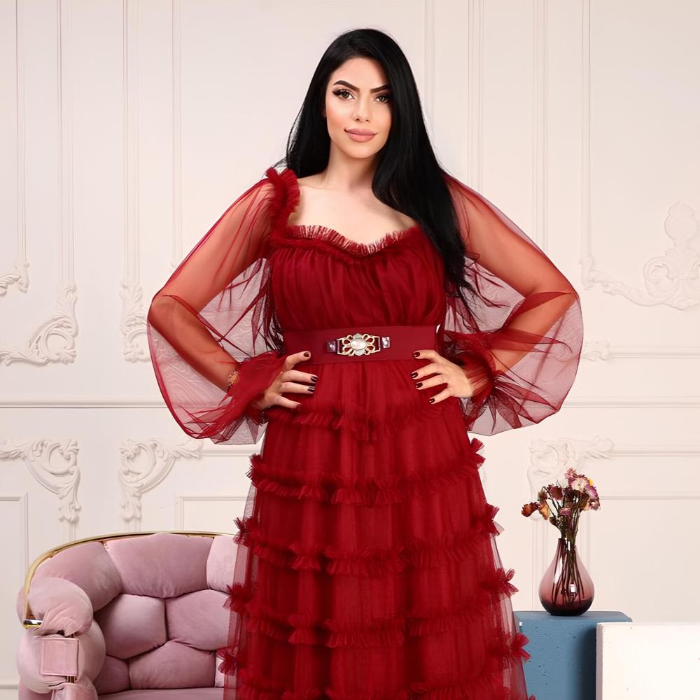 فستان ساحر بتصميم ملوكي يفيض بالأنوثة والجاذبية، يتميز بأكمام منسدلة كأمواج ناعمة تمنح حرية وانسيابية في الحركة، مع تنورة بطبقات غنية بتفاصيل رقيقة تضيف لمسة درامية أنيقة. حزام الخصر المزخرف يبرز القوام بأسلوب راقٍ، ليمنحكِ حضورًا آسرًا وإطلالة تخطف الأنظار.